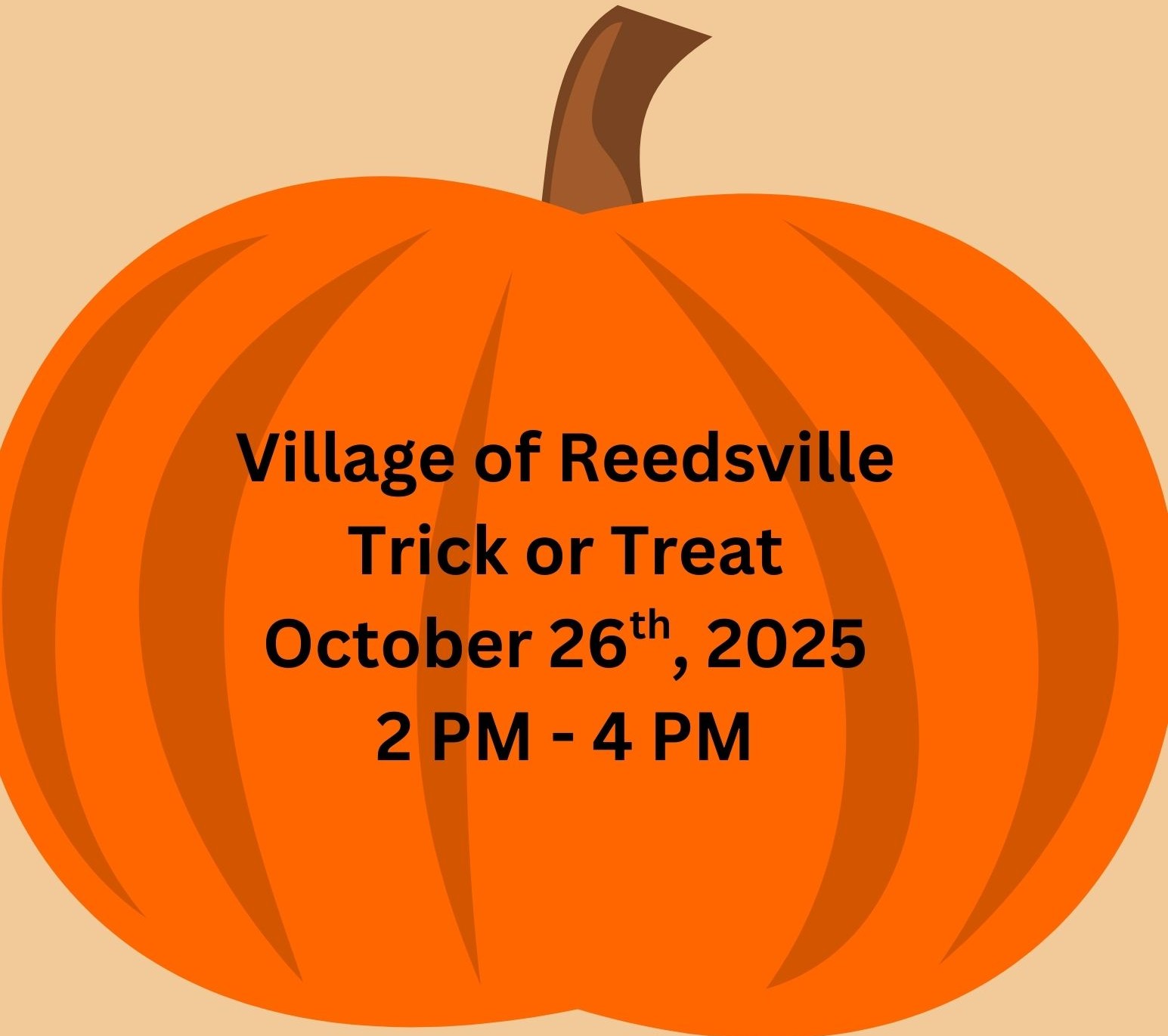 The Village of Reedsville Trick or Treating will be on Sunday, October 26th, 2025 from 2:00 PM to 4:00PM.